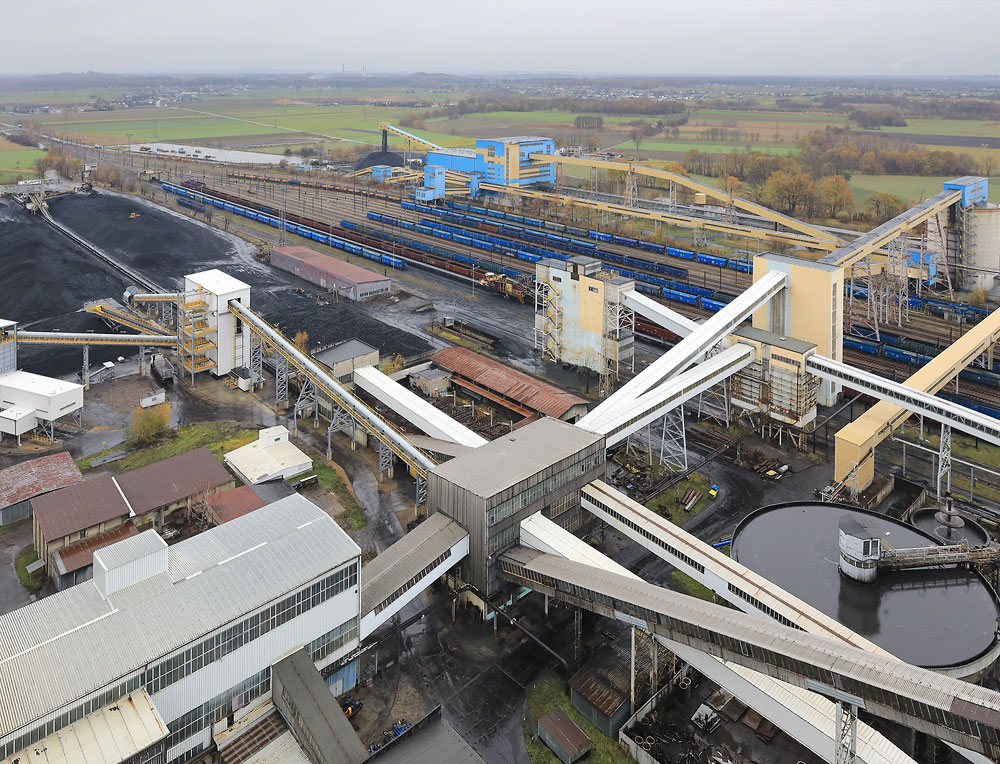 18/11/2024 | Les installations du lavoir et ses convoyeurs à bande, vus depuis la tour d'extraction du puits II