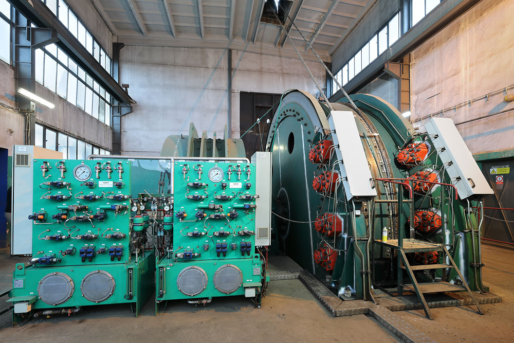20/11/2024 | Machine d'extraction 'est' du puits VI (poulie Koepe bicâble) ; à gauche groupes hydrauliques du système de freinage