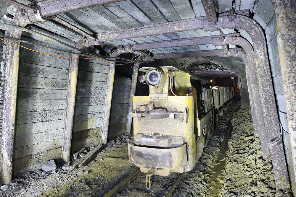29/03/2023 | Loco diesel en tête d'un train de berlines chargées sur le roulage principal (niveau 0)