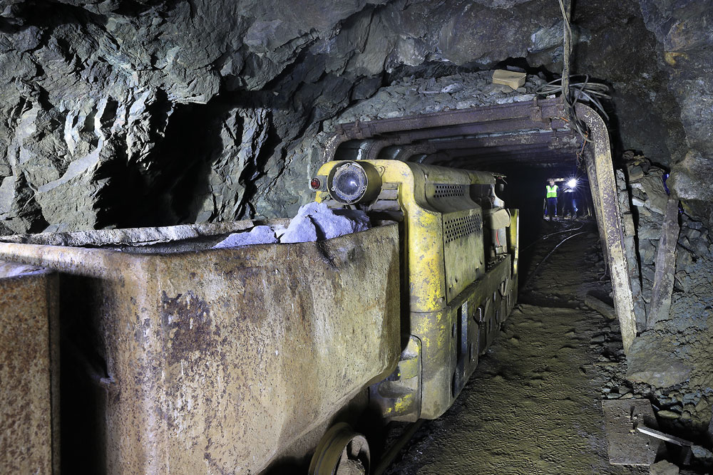 29/03/2023 | Loco diesel en tête d'un train de berlines chargées sur le roulage principal (niveau 0)