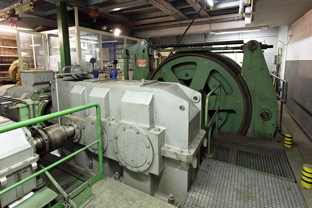 22/03/2013 | Treuil de secours du puits Nord ; au premier plan le réducteur, au fond le tambour et ses freins
