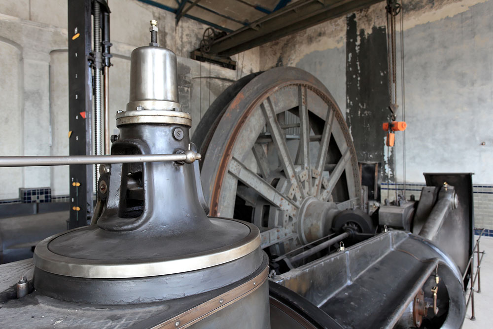 21/08/2014 | Machine d'extraction à vapeur 'est' du puits n°2 : détail sur une soupape, en arrière plan la poulie Koepe - Zeche Fürst Leopold / Dorsten