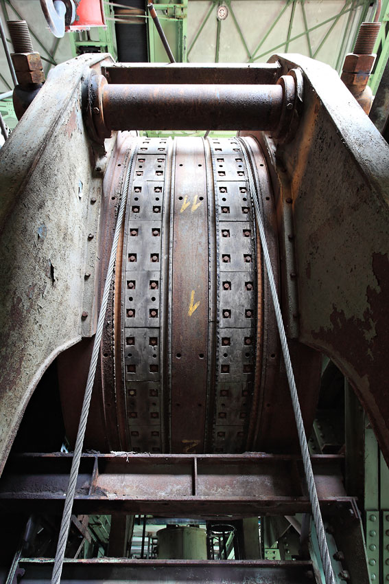 19/08/2015 | Machine d'extraction du puits n°4 : poulie Koepe quadricâble vue en contreplongée - Zeche Königsborn / Bönen