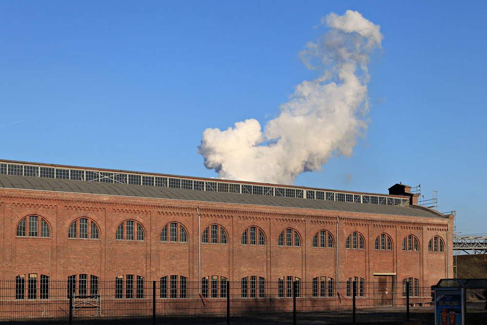 27/03/2011 | Ancien bâtiment sur le carreau Prosper II et panache de vapeur d'eau de la cokerie - Bergwerk Prosper-Haniel / Bottrop