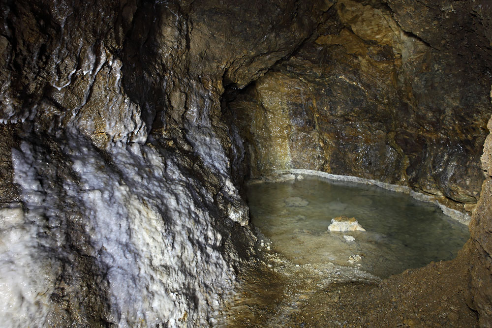 Une vasque d'eau aux parois décorées par des coulées de calcite - Mine de fer de L