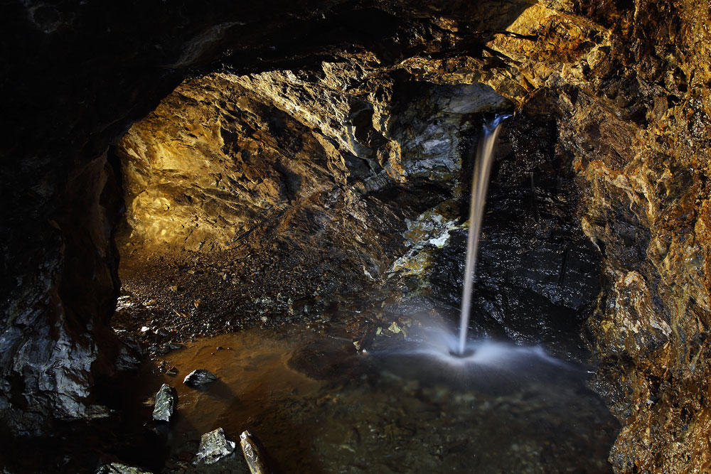 Une rivière s'écoule juste au-dessus de la galerie ; une partie de l'eau s'engouffre dans la mine par un trou et forme une petite cascade