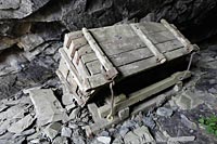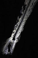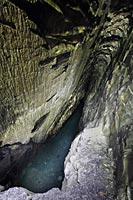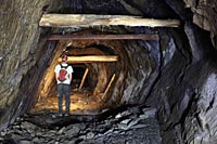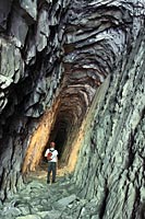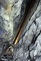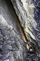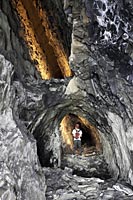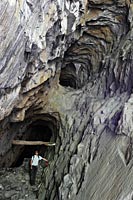Cette ancienne carrière de pierre à ciment se présente comme une saignée presque verticale au flanc de la montagne. Des ouvertures s'y étagent sur une dizaine de niveaux ; elles donnent accès à des galeries d'exploitation très semblables, longues de plusieurs centaines de mètres et s'enfonçant quasiment tout droit dans la montagne. Une des galeries visitées dans un niveau supérieur présente une morphologie très particulière : au fur et à mesure que l'on s'enfonce sous terre, le filon devient plus étroit, mais il a été exploité sur une hauteur de plus en plus importante. A tel point que l'on finit par ne plus distinguer le toit de la galerie, probablement situé à plus de 50 mètres au-dessus de nos têtes. L'absence totale d'étayage dans cet immense dépilage rend le lieu très impressionnant, limite oppressant, avec ce sentiment que la montagne pourrait se refermer sur nous à tout moment.