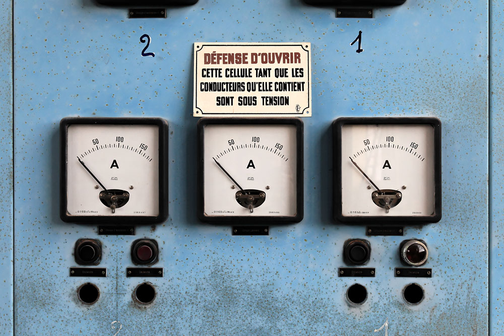 23/04/2012 | Mine Rodolphe : ampèremètres sur une armoire électrique de la machine d'extraction du puits Rodolphe I