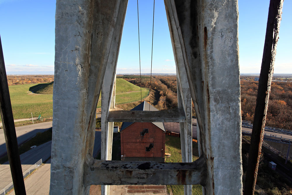 25/11/2013 | Mine Joseph-Else : bâtiment de la machine d'extraction du puits Else vu au travers des bigues en béton du chevalement