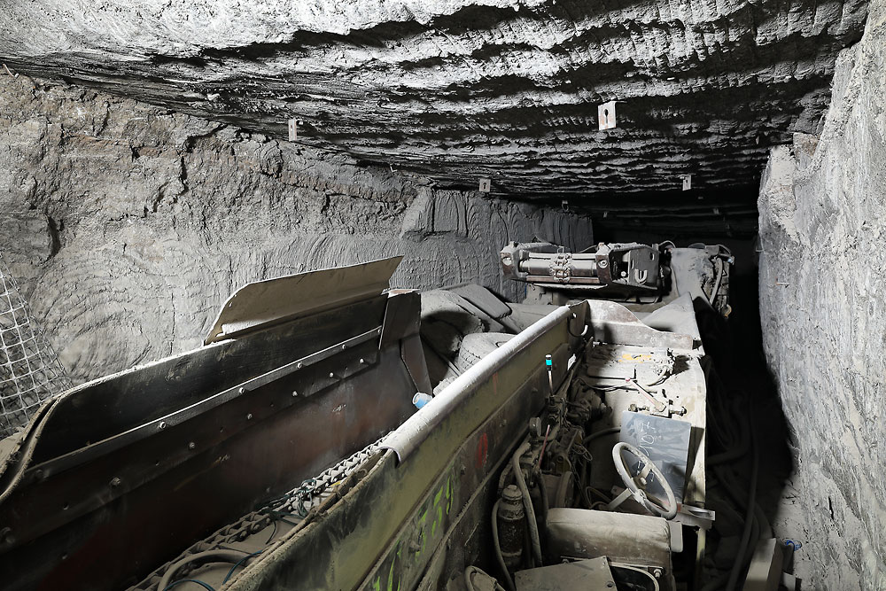 Camion navette Joy 10SC utilisé avec un mineur continu Heliminer Jeffrey (au fond)