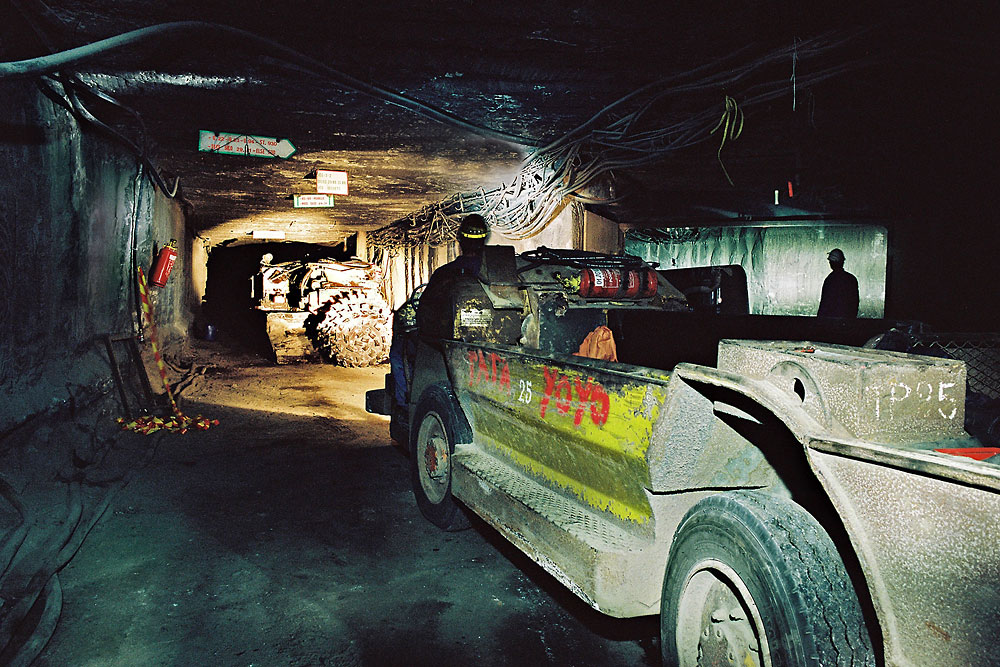 Engin de transport du personnel TP 25, dans le fond on aperçoit un mineur continu à attaque ponctuelle Paurat E195