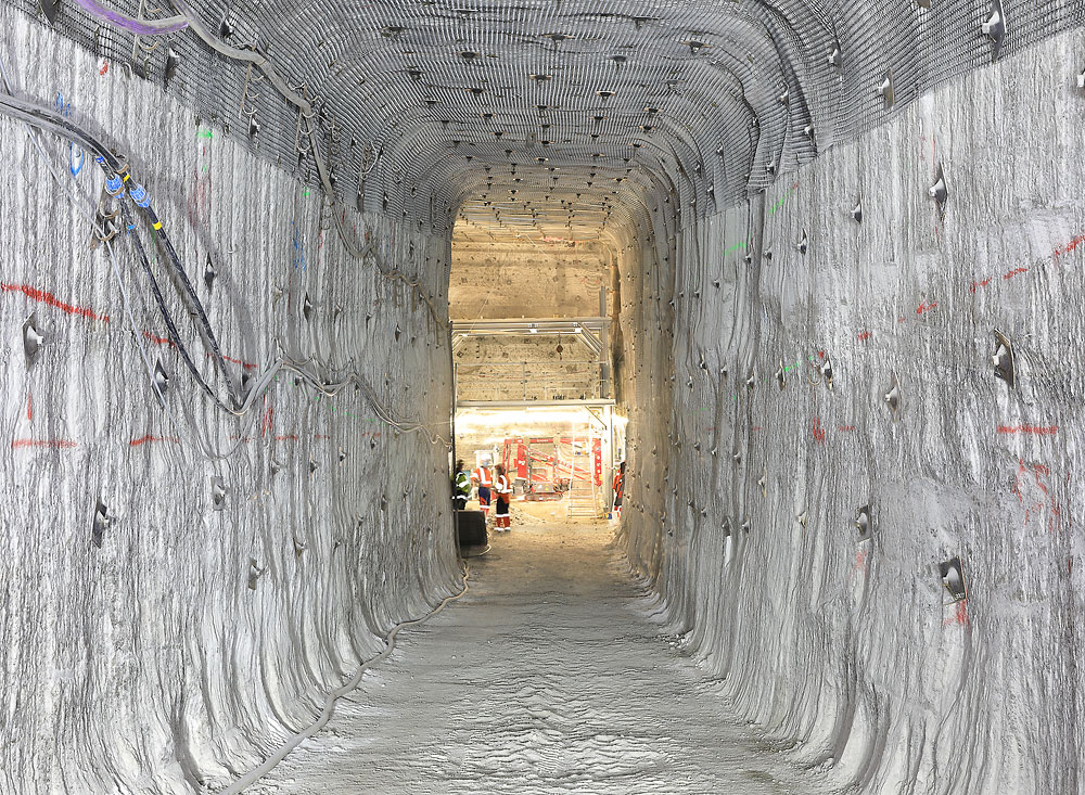Haute galerie d'accès à une chambre souterraine, entièrement boulonnée