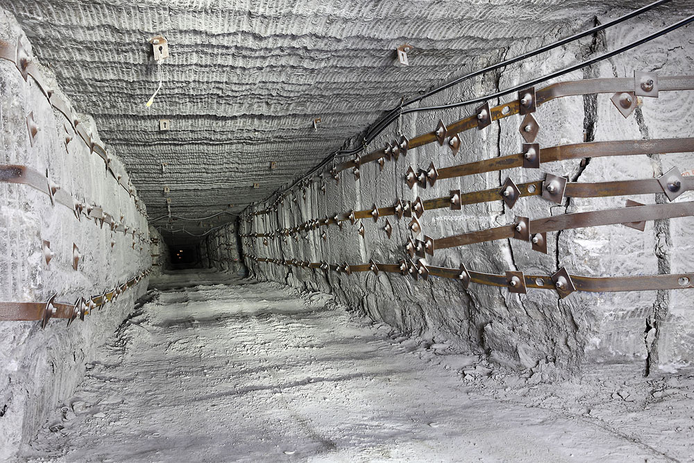 Galerie tracée par un mineur continu Heliminer Jeffrey ; les parements, soumis à de fortes pressions, sont renforcés par boulonnage