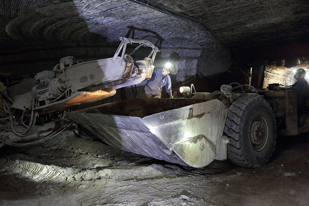 Traçage d'une galerie avec un mineur continu Paurat E195 ; le sel excavé est repris par le chargeur Wagner CW21