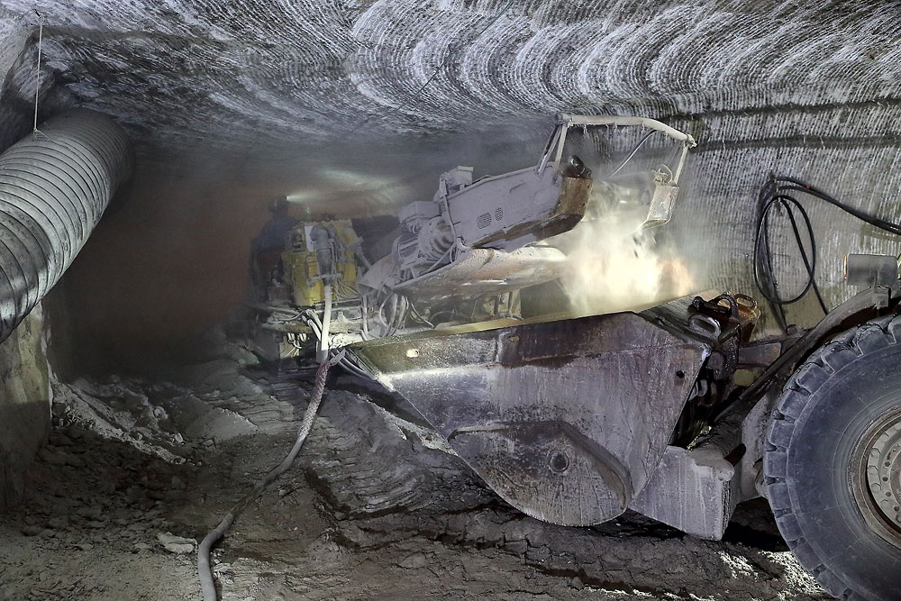 Traçage d'une galerie avec un mineur continu Paurat E195 ; le sel excavé est repris par le chargeur Wagner CW21