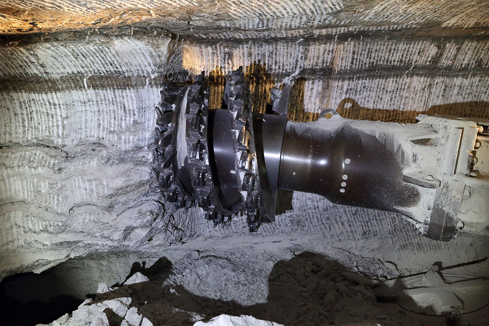 Détail sur la tête d'abattage conique équipée de 72 pics d'un mineur continu Paurat E195