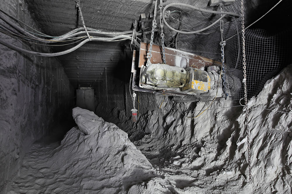 Extrémité d'un convoyeur à bande au croisement de deux galeries