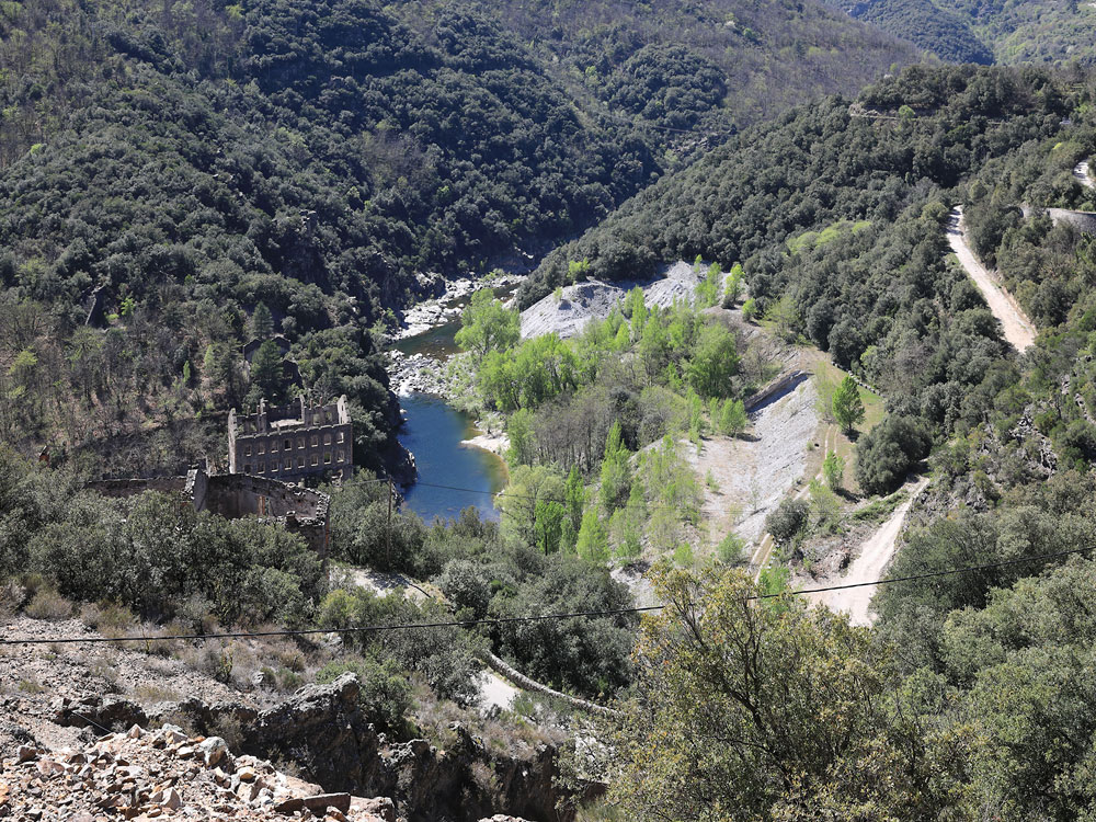 17/04/2022 | Mines de Sainte-Marguerite-Lafigère : vue sur les vestiges de la laverie et les stériles miniers, au bord du Chassezac