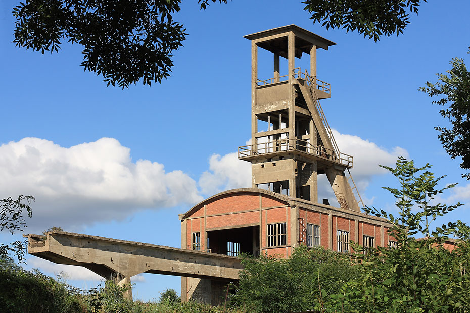 25/07/2009 | Chevalement en béton et recette du puits Central ; notez la voie suspendue empruntée par les berlines - Noyant d'Allier