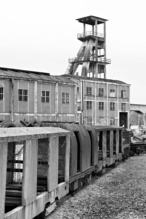 21/03/2013 | Wagons pour le transport du personnel ; en arrière plan le puits Central et son chevalement en béton - Noyant d'Allier
