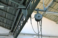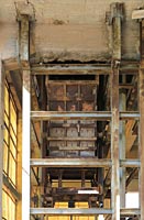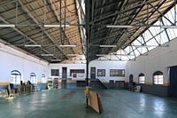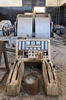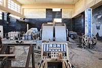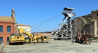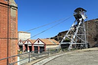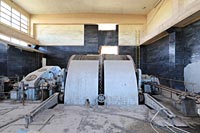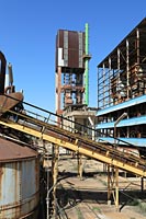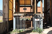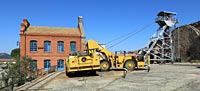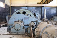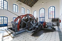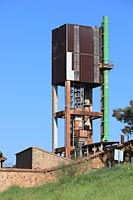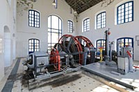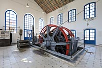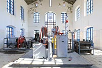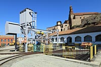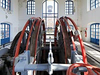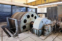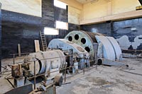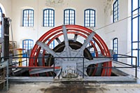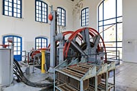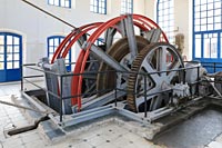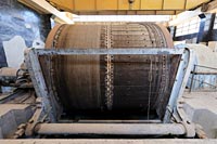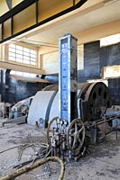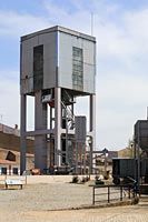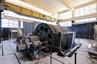 Cette machine d'extraction électrique à tambour GHH/Siemens date de la construction du puits San Joaquín. Elle est restée en service jusqu'à l'installation de la tour d'extraction, le bâtiment qui l'abrite ayant été préservé.