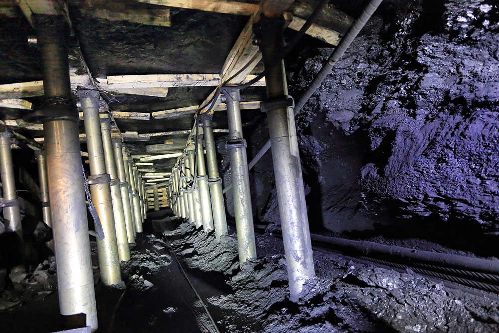 29/06/2016 | Plus bas dans la taille, le soutènement est assuré par des étançons hydrauliques ; à droite le front de taille