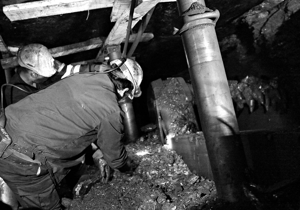 29/06/2016 | Au cœur de la taille, les mineurs suivent le passage de la haveuse, dont on peut voir la tarrière supérieure