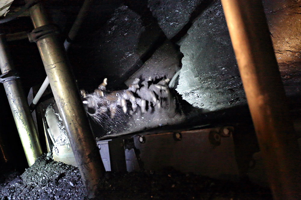 29/06/2016 | Le front de taille au passage de la haveuse ; aspersion d'eau au niveau de la tarière pour limiter la formation de poussières