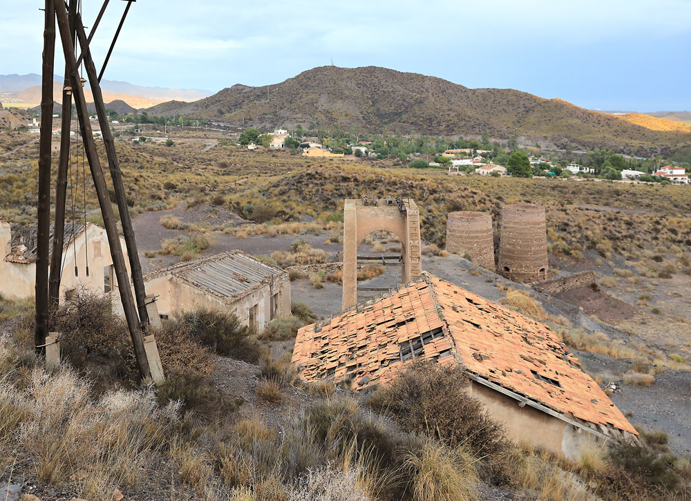 04/01/2024 | Vue sur les installations de la mine Rica : chevalement en maçonnerie et fours de grillage