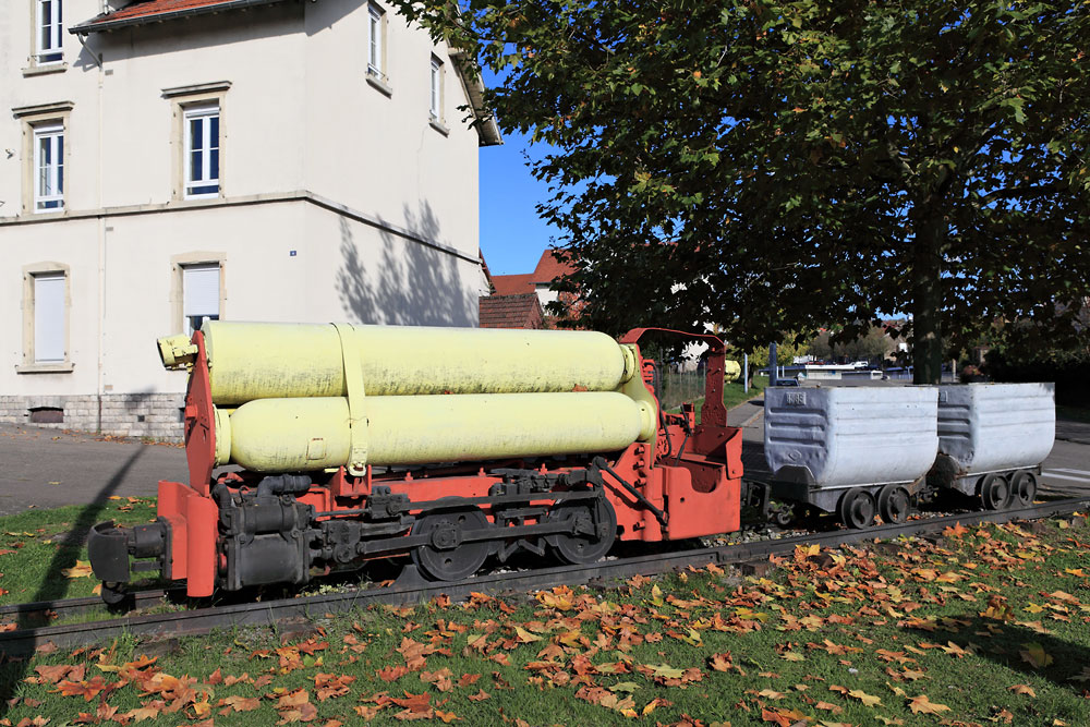 28/10/2012 | Locomotive à air comprimé et berlines exposées près du siège Vouters - Freyming-Merlebach