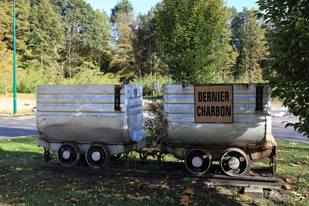 28/10/2012 | Les berlines ayant remonté le dernier charbon exposées sur un rond-point à l'entrée du siège Reumaux - Freyming-Merlebach