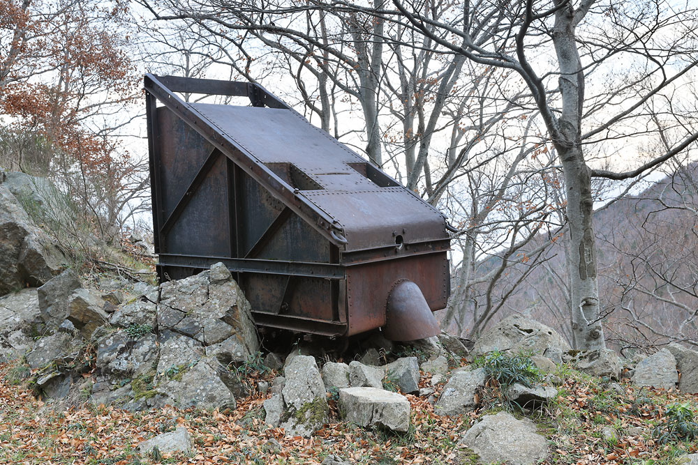 29/12/2022 | Mine des Manerots : benne du plan incliné (à l'envers) ; on peut voir la goulotte de remplissage en eau