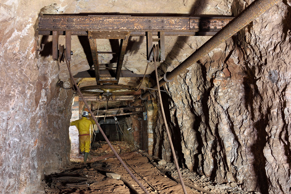 Au bout du roulage, près d'un puits, la poulie de retour du câble du traînage