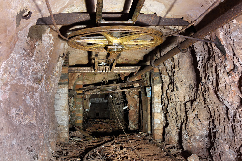 Au bout du roulage, près d'un puits (situé sur la droite), la poulie de retour du câble du traînage