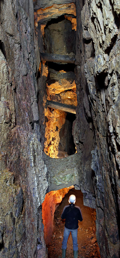 Un étroit dépilage subvertical, filon du bas - Mine de fluorite et baryte L