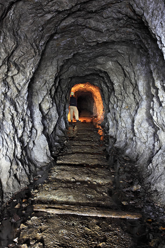Travers-banc principal où l'on peut voir les marques laissées au sol par la voie de roulage - Mine de plomb argentifère et baryte BDM