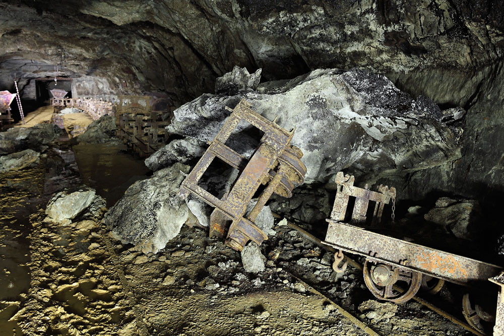 Châssis de berline écrasé sous un rocher dans la gare souterraine de la mine