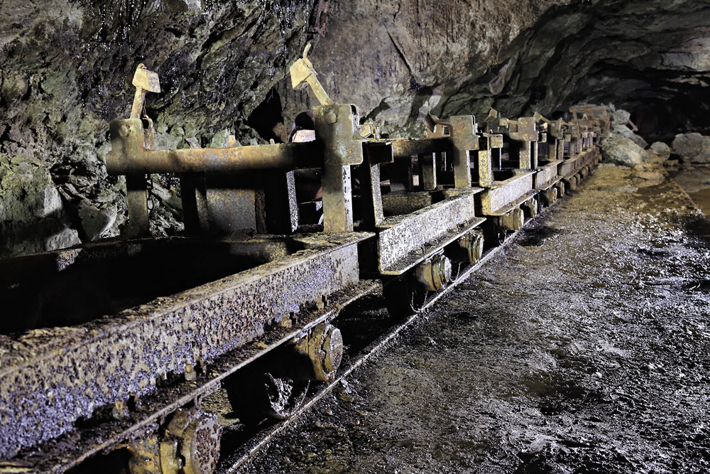 Un 'train' composé de châssis de berlines dans la gare souterraine de la mine