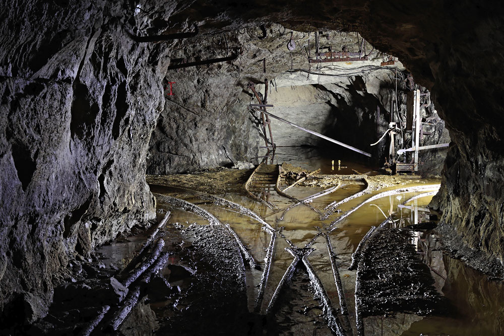 Jolis aiguillages devant l'entrée de la gare souterraine ; au fond se trouve un plan incliné vers l'étage inférieur (noyé)