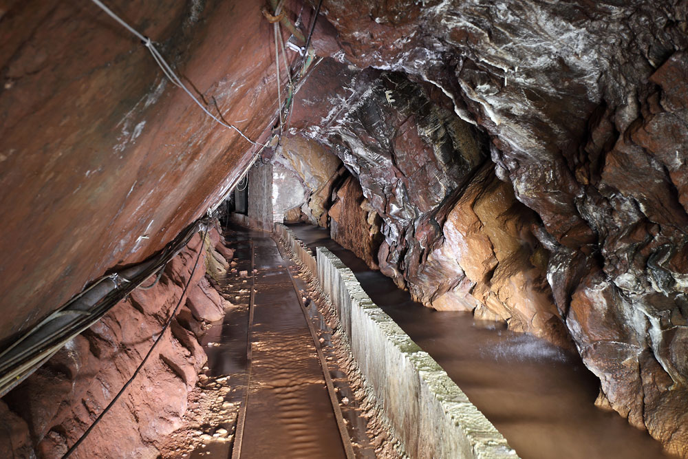 Galerie de roulage tracée dans la couche ferrifère ; elle est longée par un canal pour l'évacuation de l'eau de mine