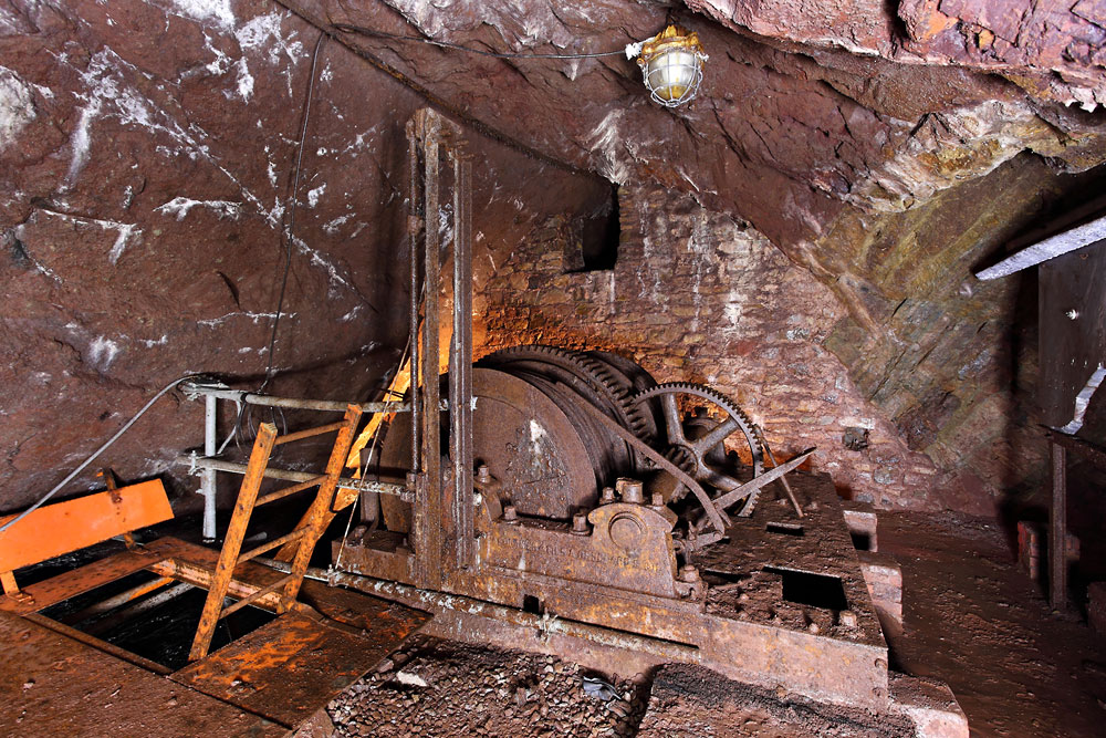 En haut du plan incliné, le treuil électrique ; on peut voir l'indicateur de position