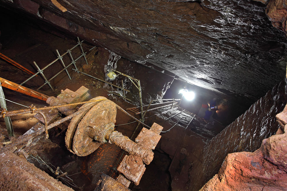Contreplongée sur un ancien plan incliné qui permettait de remonter le minerai jusqu'au niveau de roulage débouchant au jour