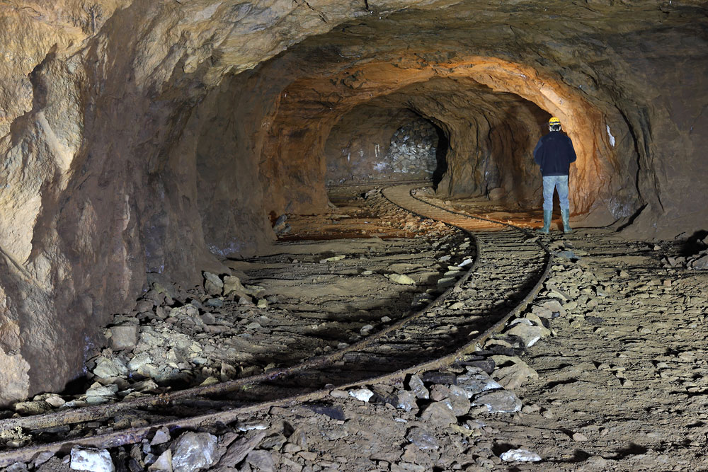 La voie de roulage serpente dans une galerie secondaire desservant des quartiers d'exploitation