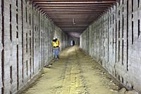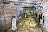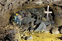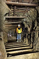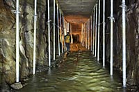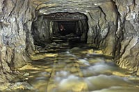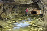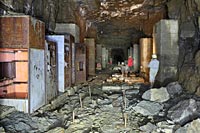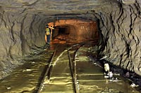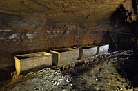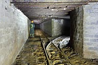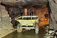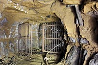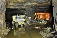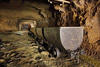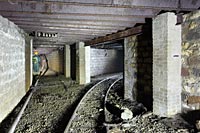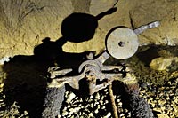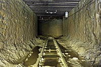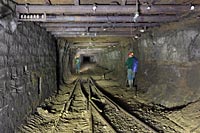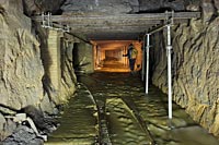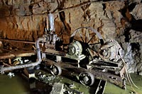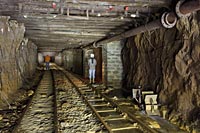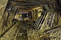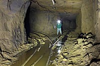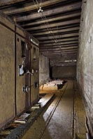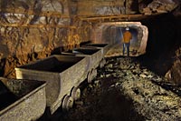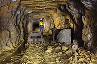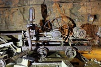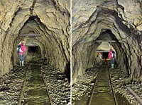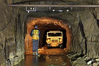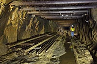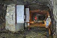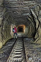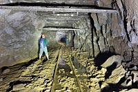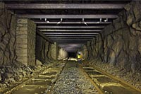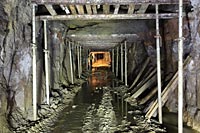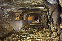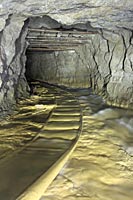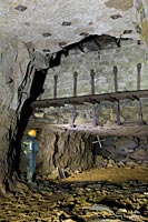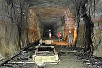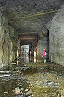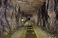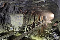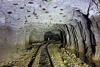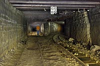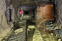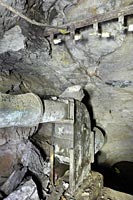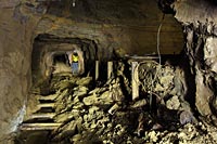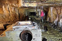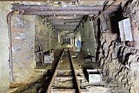 Nous avons également suivi une galerie de roulage secondaire comportant encore un peu de matériel (berlines, stock de rails...). Elle est bordée par des quais de chargement du minerai dans les wagonnets. Des engins électriques faisaient la navette entre les chantiers et la voie de roulage. Près de l'entrée, nous avons pu voir l'ancienne gare souterraine où les mineurs prenaient le train vers le fond de la mine.