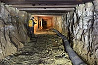 La visite de cette importante mine (400 kilomètres de galeries) a débuté en suivant la grande galerie de roulage (nommée «Secondaire 4») dans laquelle circulaient les wagons de 10 tonnes. Sur les côtés nous pouvons voir d'anciens travaux souvent foudroyés mais aussi un des derniers quartiers exploités avant la fermeture de la mine. Après plus de 4,5 kilomètres de marche, nous avons atteint un bel atelier où était produit l'air comprimé nécessaire au fonctionnement de la mine. Malheureusement les machines ont toutes été démantelées et il ne reste plus que les réservoirs d'air comprimé. Il existait deux autres ateliers principaux comme celui-ci au fond de la mine, dont celui des «Six-Bornes» au volume impressionnant.