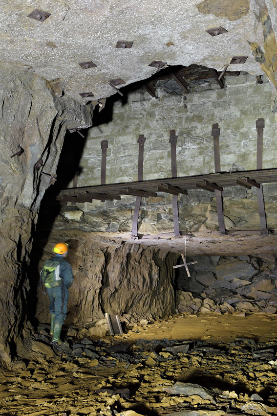 Galerie de roulage recoupée par une galerie plus récente, les rails sont suspendus au-dessus du vide ; au fond le foudroyage