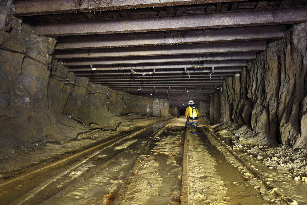 Le toit de la galerie de roulage «Secondaire 4» est souvent consolidé par de grosses poutres IPN