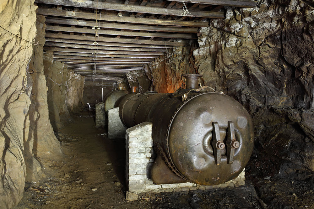 Réservoirs d'air comprimé dans un grand atelier au cœur de la mine