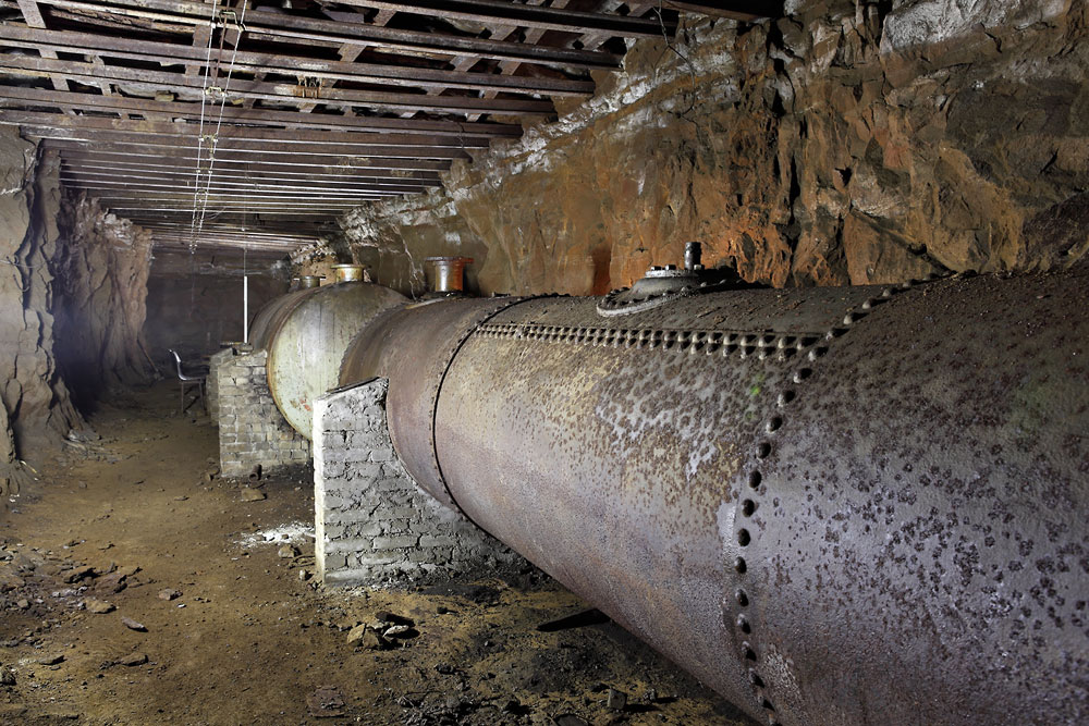 Réservoirs d'air comprimé dans un grand atelier au cœur de la mine