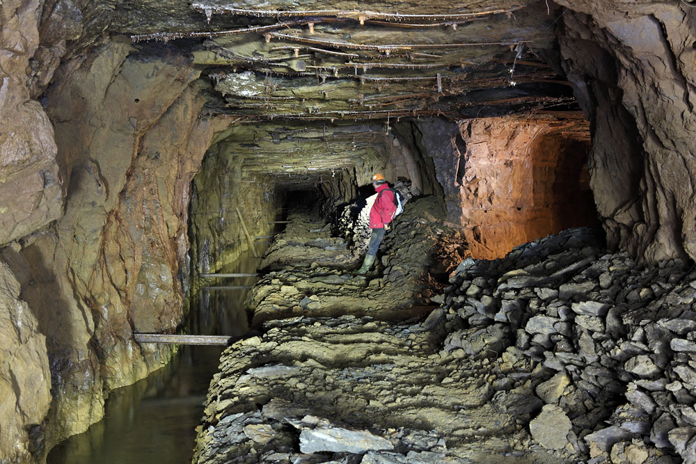 Cette galerie de roulage est longée par un petit canal pour l'écoulement de l'eau d'exhaure